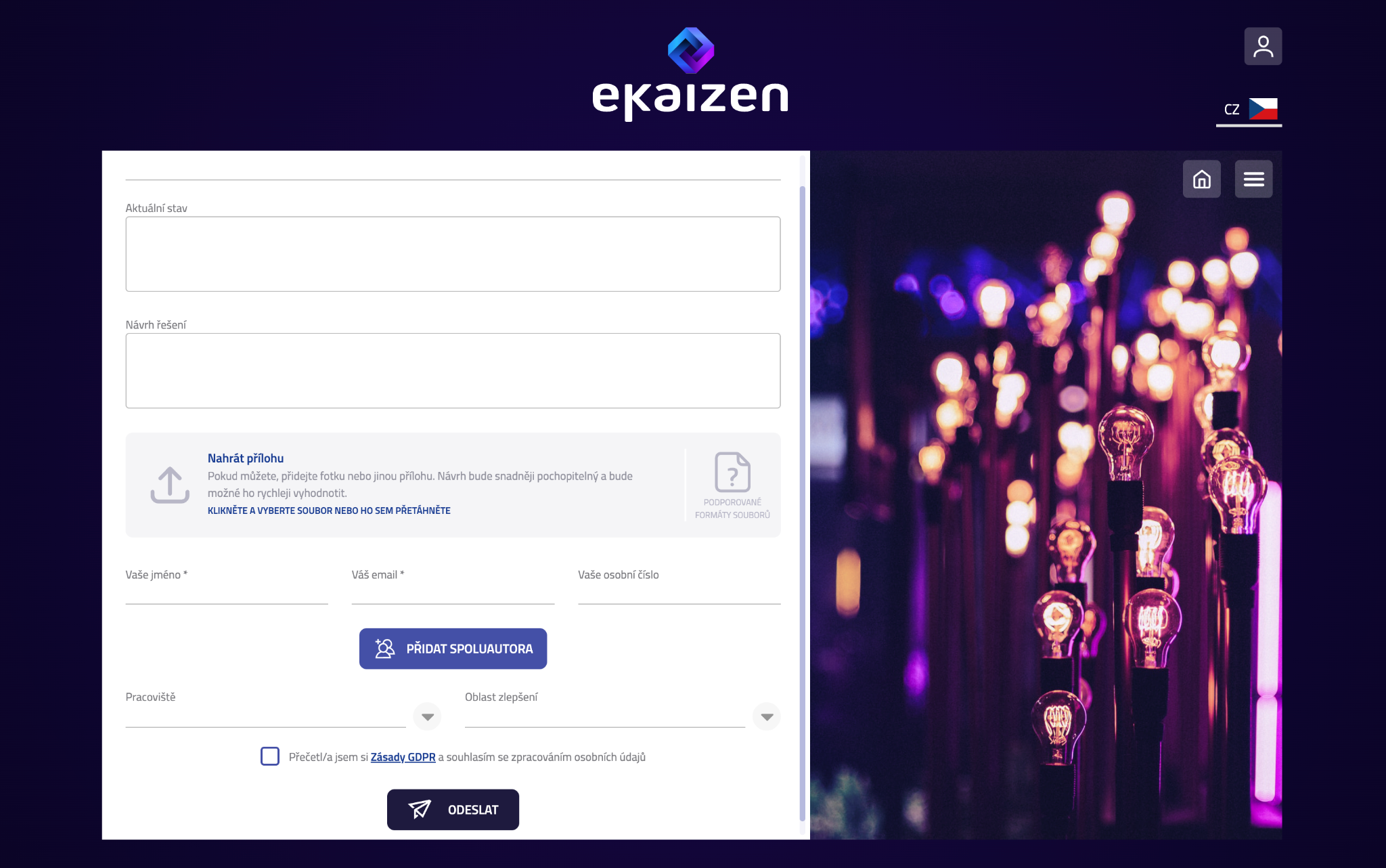 Po výběru odpovídající dlaždice v portálu eKaizen se otevře formulář pro podání návrhu. Jeho konkrétní podoba a povinná pole se mohou lišit podle nastavení ve vaší společnosti, samotný postup je ale většinou stejný.