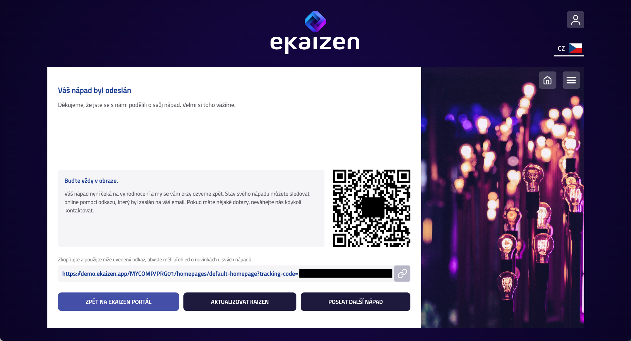 Po vyplnění formuláře klikněte na tlačítko Odeslat. Ihned se zobrazí potvrzení s odkazem a QR kódem, pomocí kterých se k návrhu můžete později vrátit.