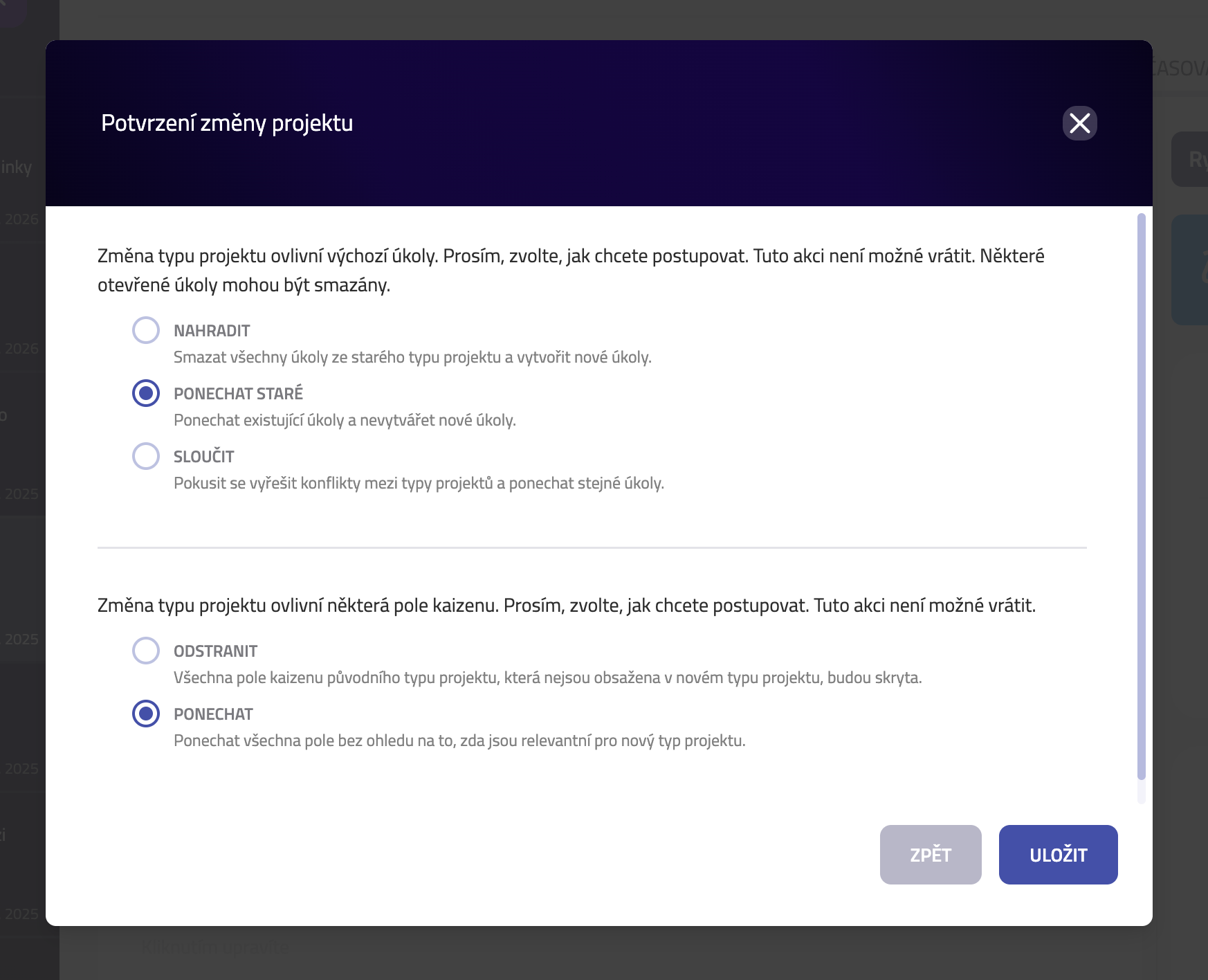 - Ponechat - všechna pole karty projektu budou zachována - bez ohledu na to, zda jsou relevantní pro nový typ projektu.