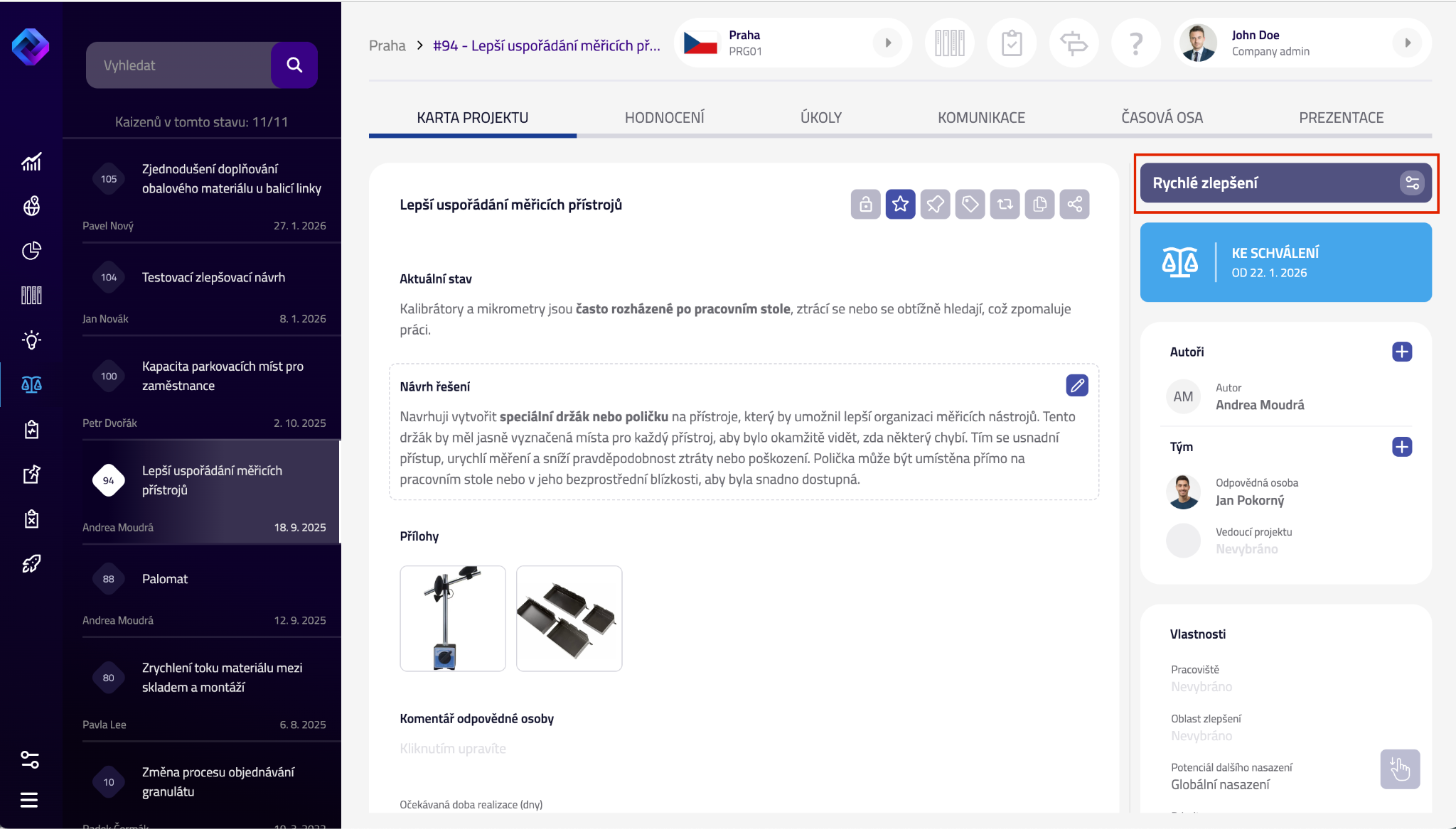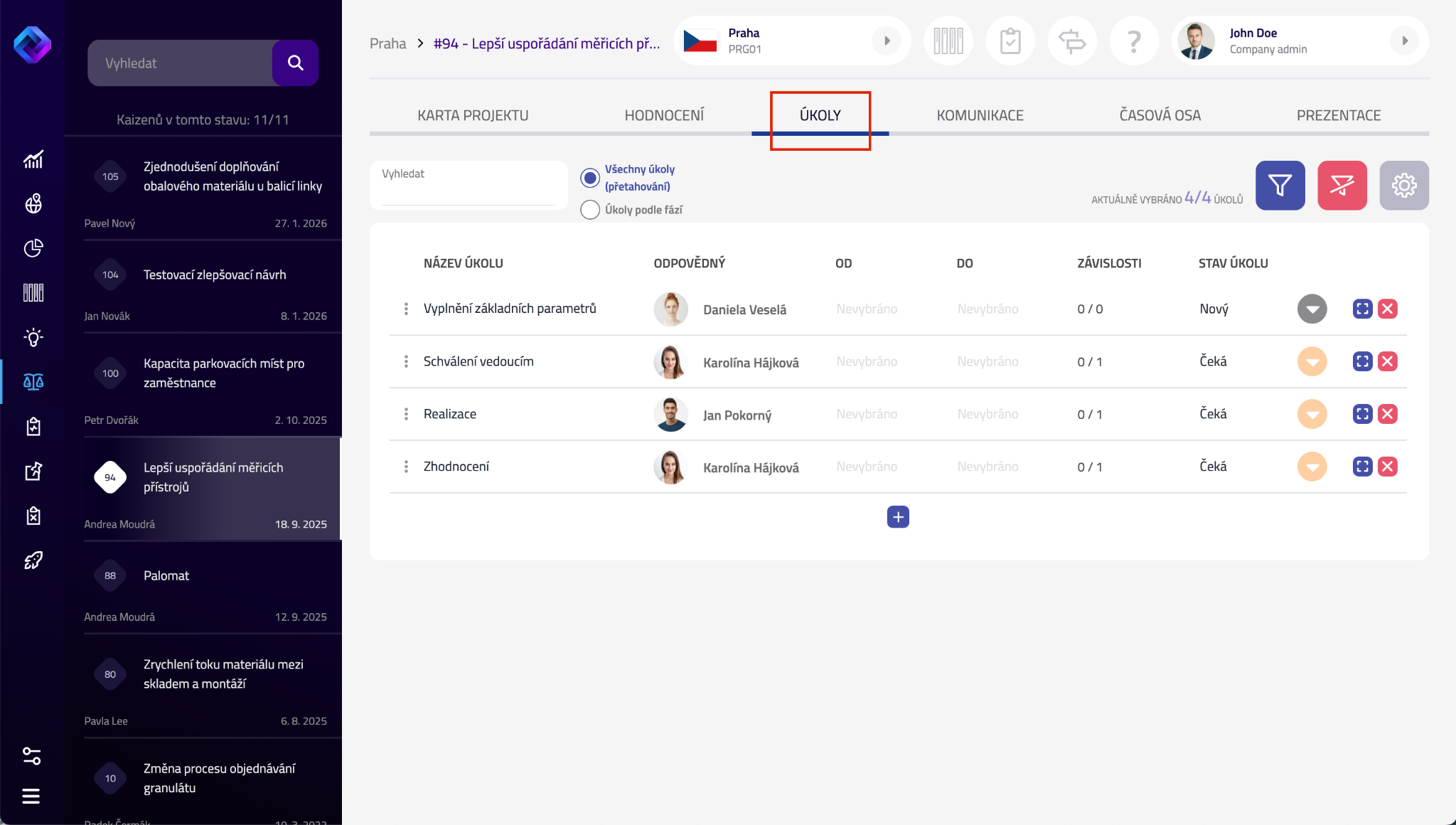 - Úkoly – postup fází a úloh, včetně schvalování, hodnocení a závěrečné revize.
