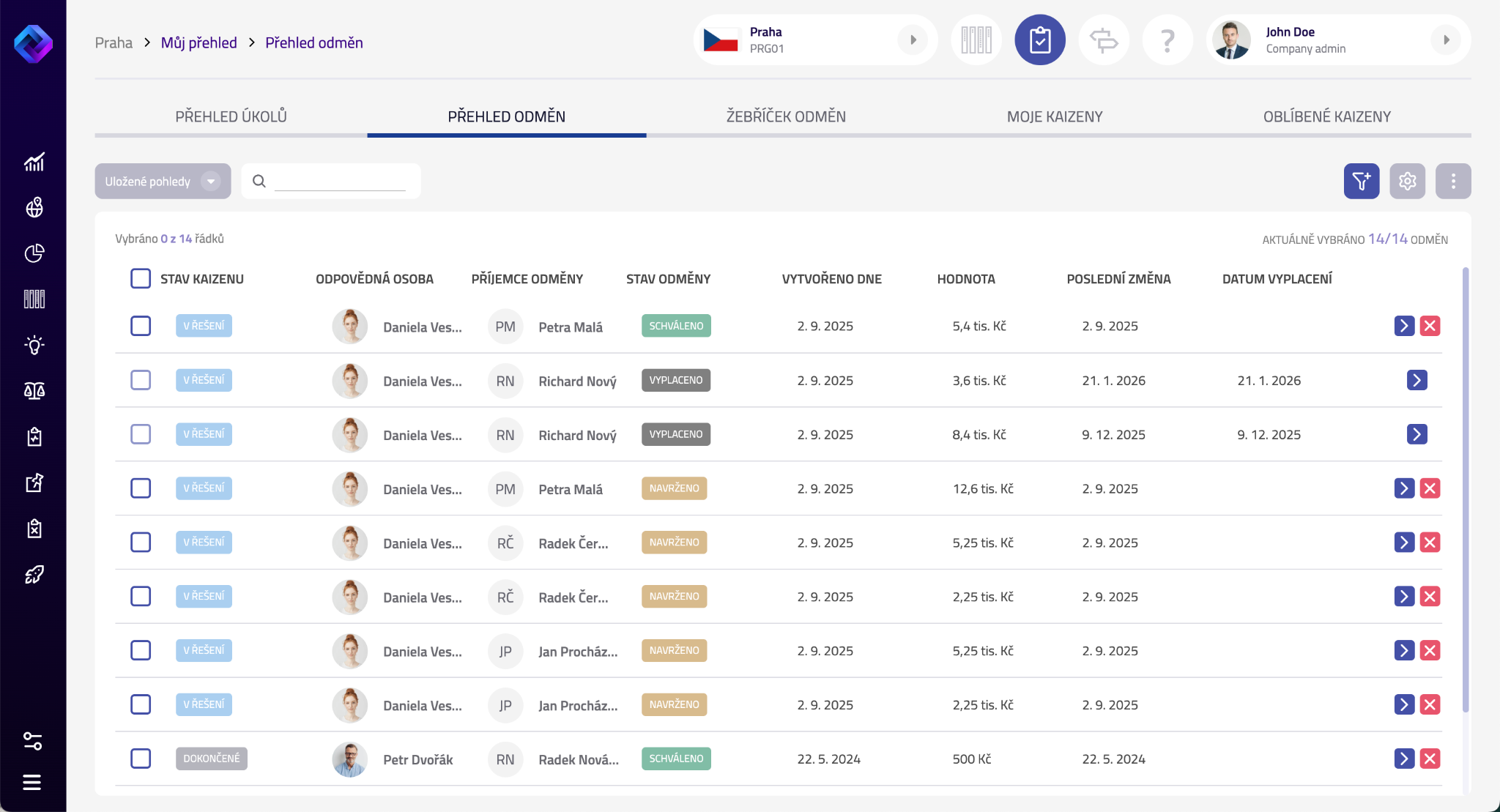 Každá odměna prochází jednoduchým procesem: Navrženo → Schváleno → Vyplaceno.