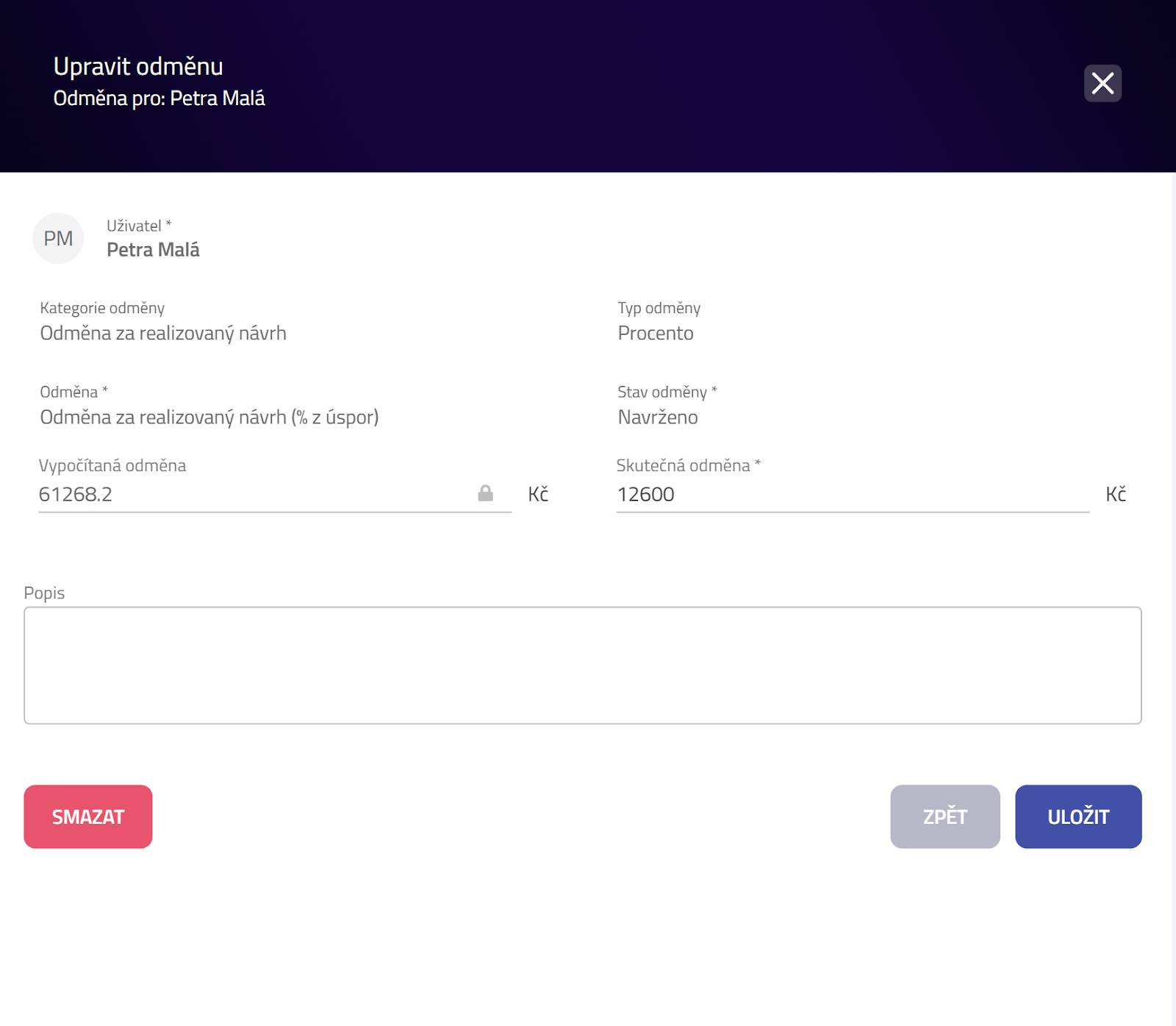 - Uložte.Po přepnutí na Schváleno se mohou některá pole uzamknout. Pro změny vraťte odměnu do Navrženo nebo postupujte dle vašeho procesu.