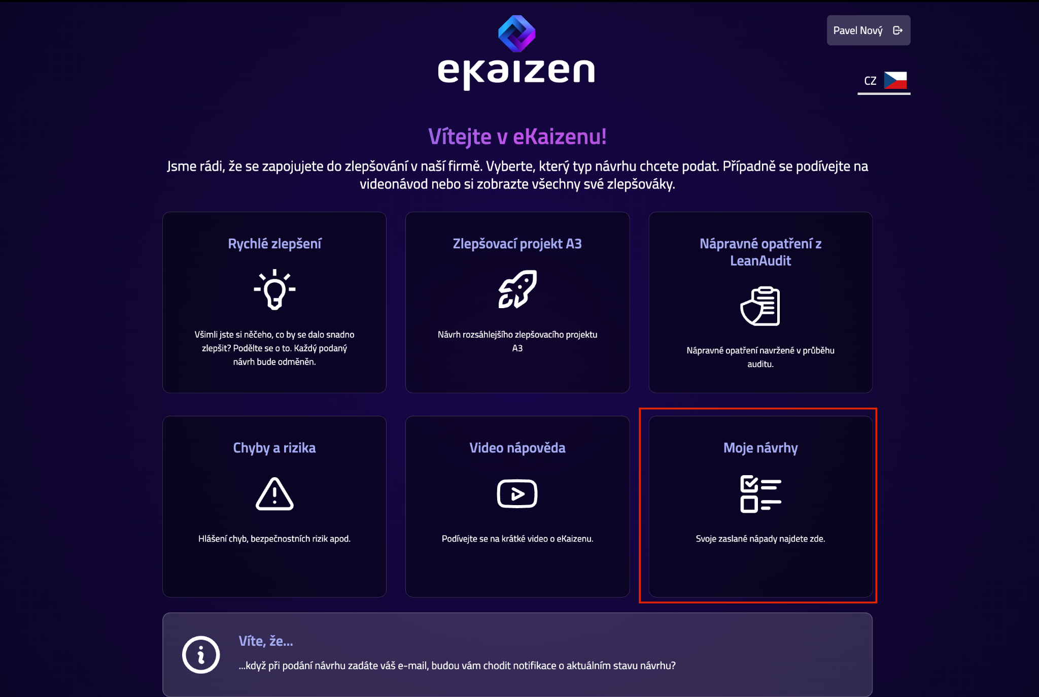 Všechny své návrhy najdete také v dlaždici Moje návrhy na portálu eKaizen.