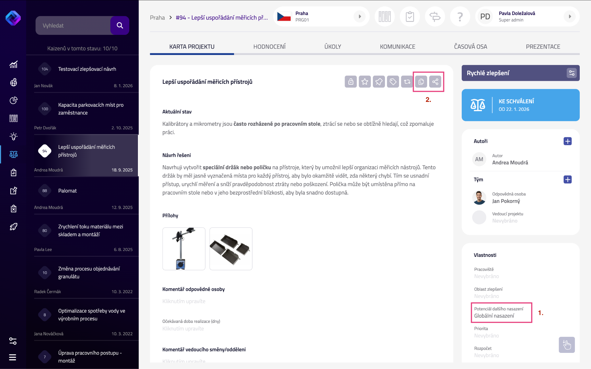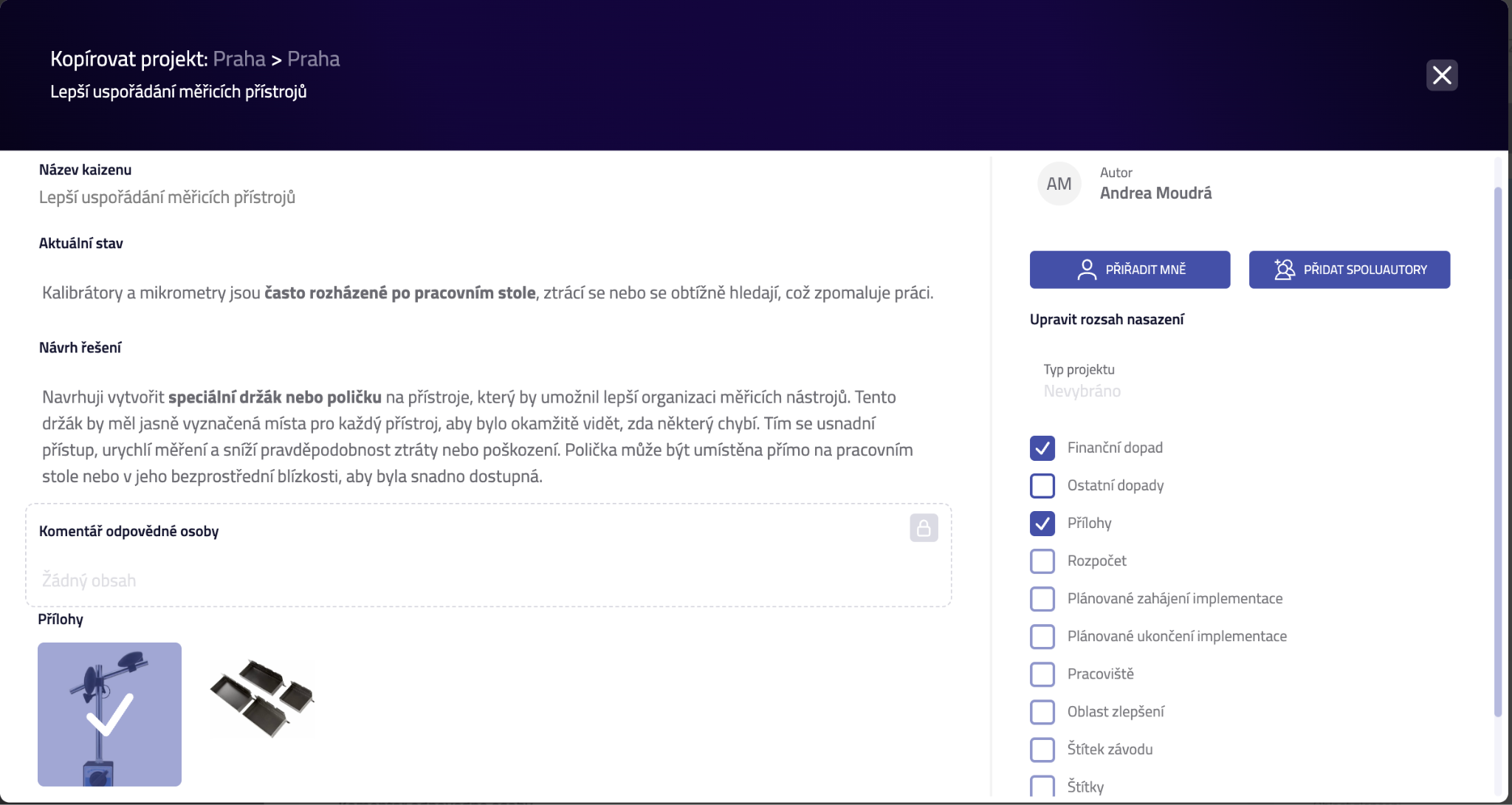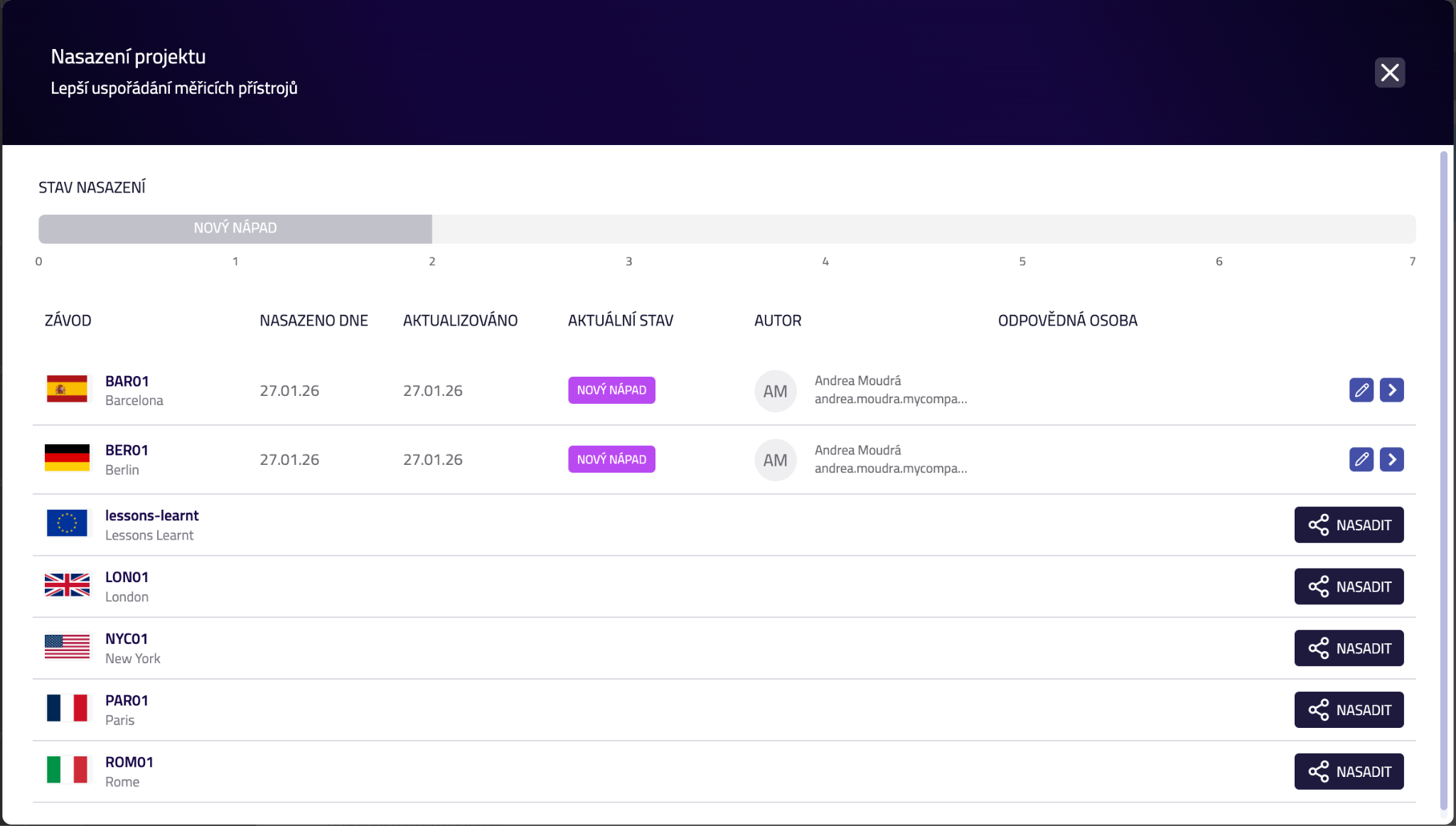 Nasazení projektu zjednodušuje replikaci úspěšných řešení. Umožní vytvořit kopii projektu a použít ověřené postupy v jiné lokalitě - v rámci stejného závodu (např. na jiném oddělení) nebo i v různé pobočce. Pomáhá sdílet best practices, zrychlit zavádění a udržet konzistenci napříč místy.