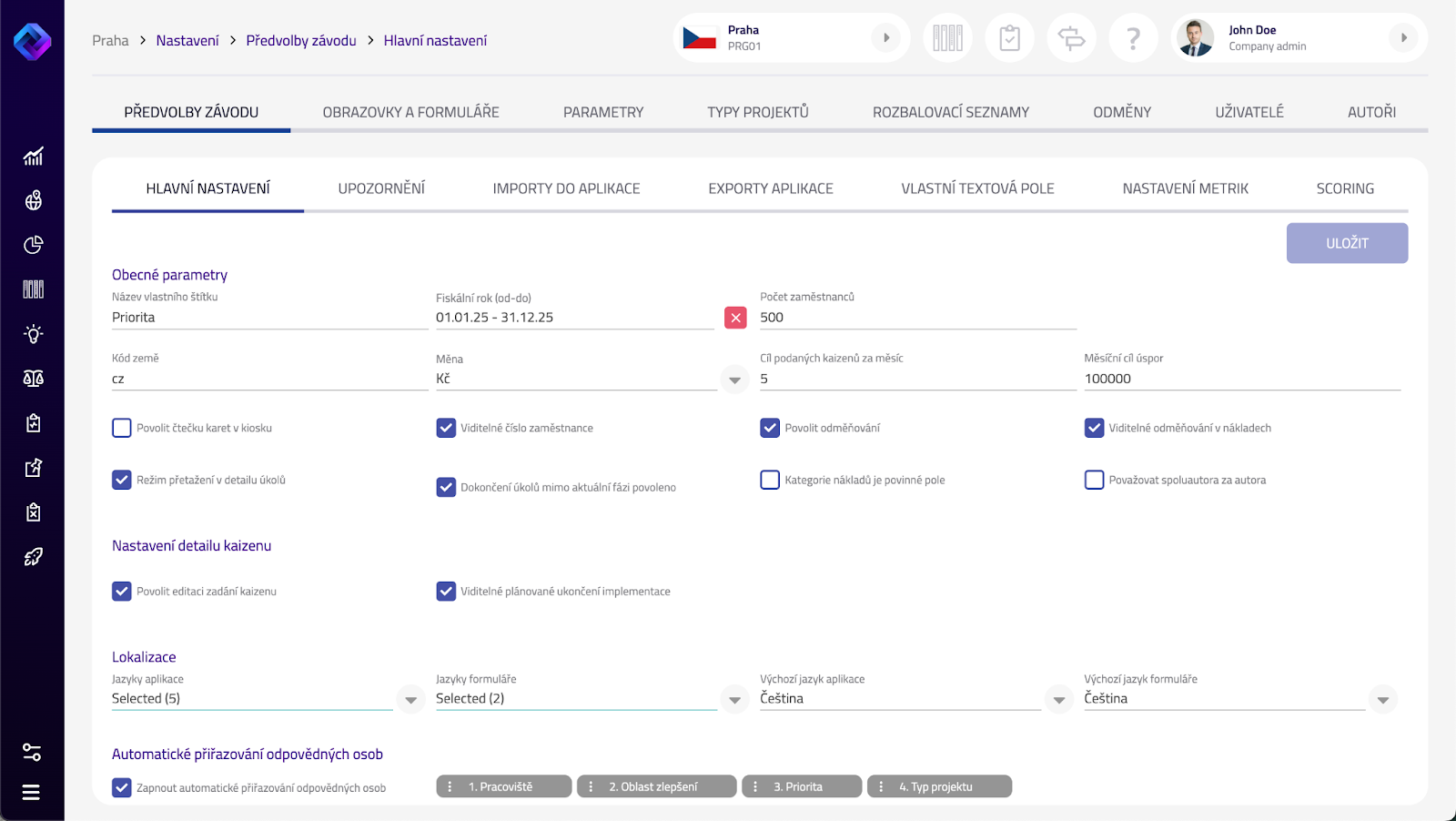 Základní nastavení na úrovni závodu, která ovlivňují názvy, účetní období, měnu a klíčové chování v eKaizenu. Zde se nastavuje účetní rok, lokalizace, měsíční cíle pro podané návrhy a úspory a také se zde aktivují nebo vypínají vybrané funkce (např. odměny).