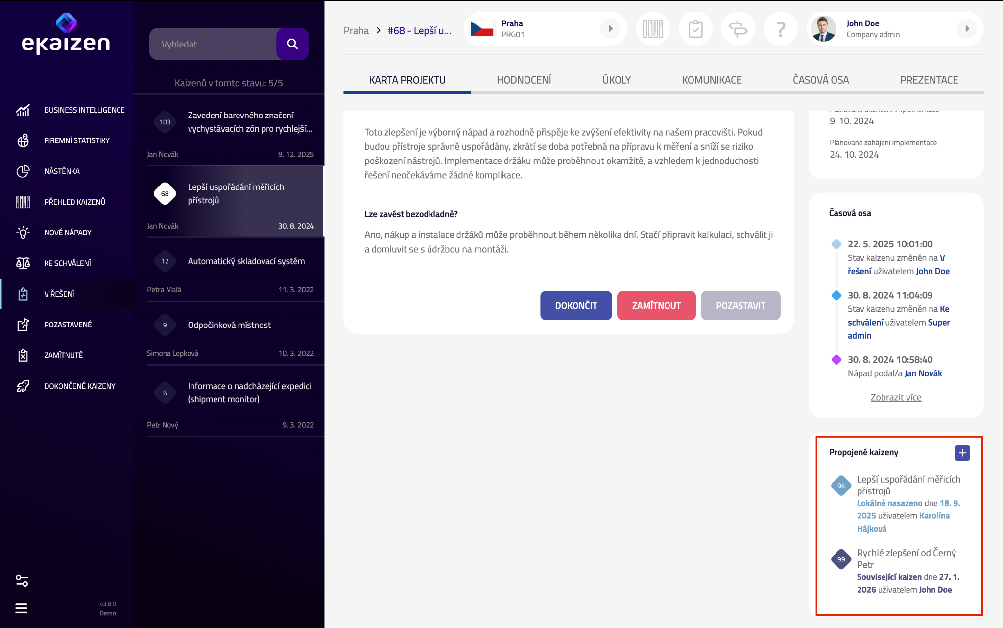 V bočním panelu Karty projektu najdete prvek Propojené projekty. Tato funkce slouží k vytváření a správě vztahů mezi samostatnými projekty.