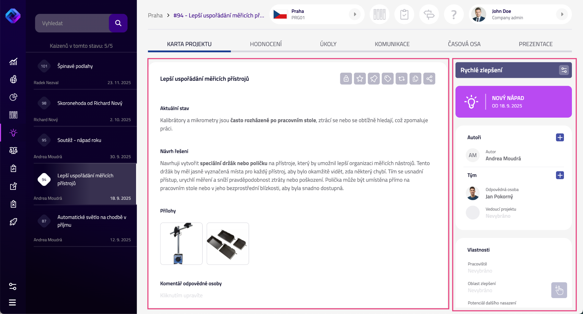 Karta projektu je hlavní obrazovka, se kterou při řízení projektů v eKaizenu pracujete. Obsahuje všechny klíčové informace - od původního návrhu projektu, který zadal autor, až po detaily doplňované projektovým manažerem a týmem v průběhu realizace.