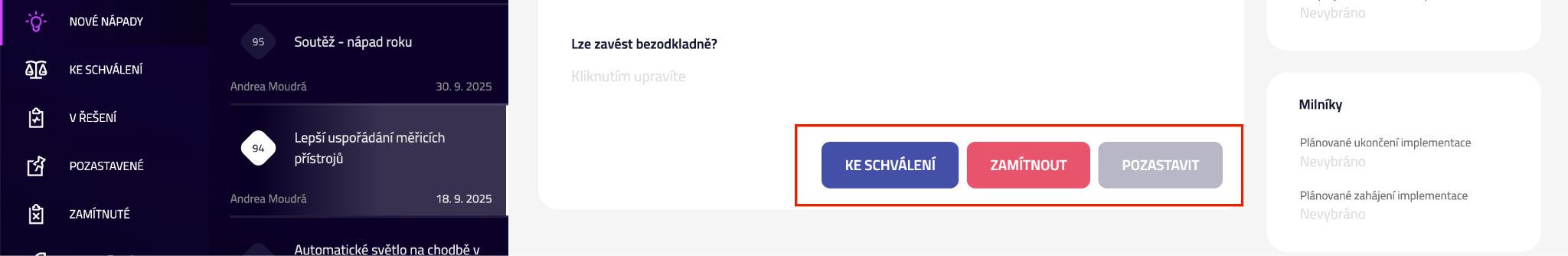 Nové nápady | [Ke schválení] [Zamítnout] [Pozastavit] |