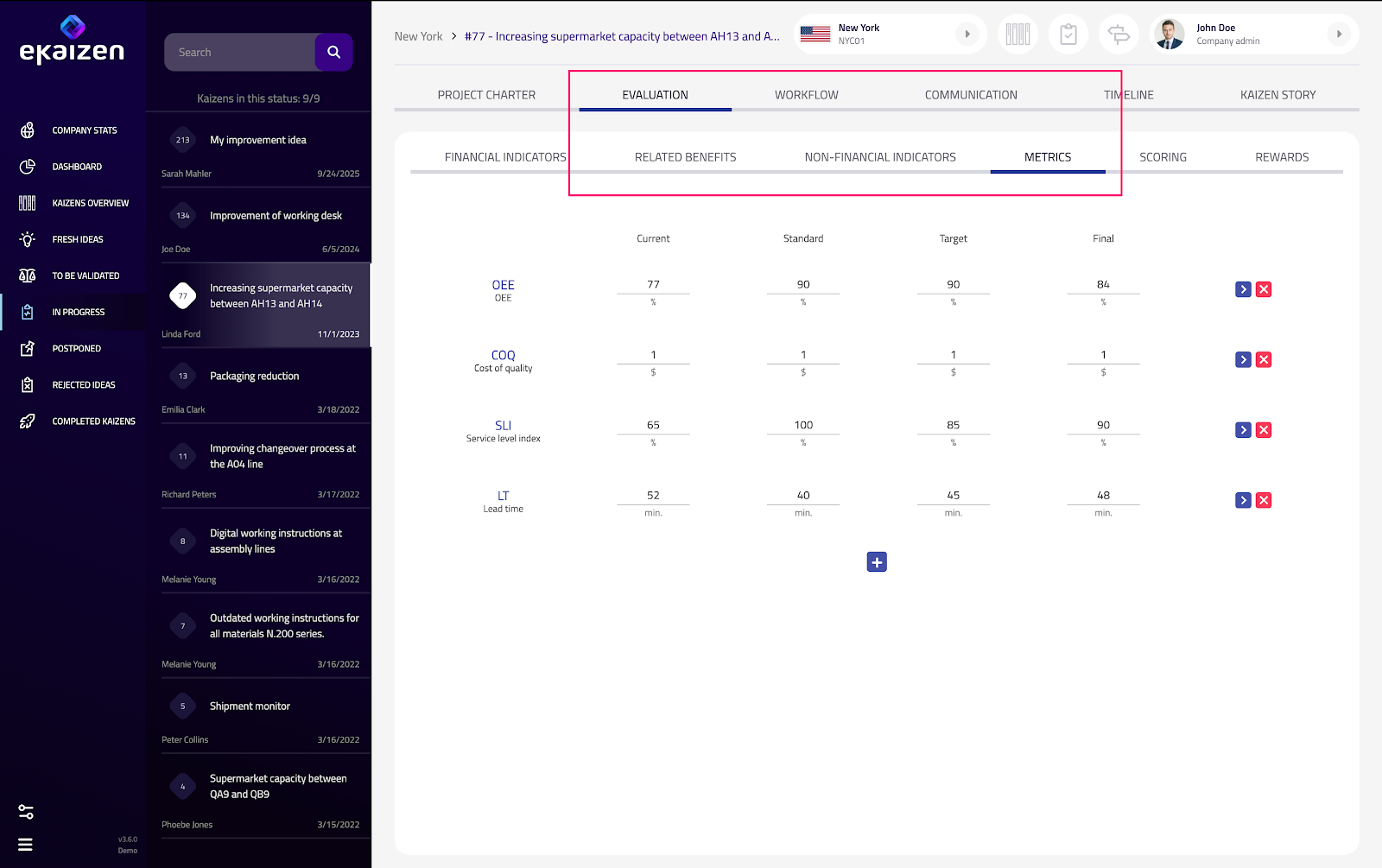 Metrics is one of the Evaluation tools in eKaizen that helps you track the performance and impact of your project over time. It complements tools like Scoring and Financial Evaluation by showing the…