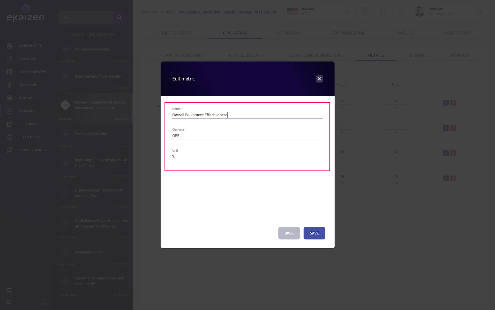 Don’t see any predefined metrics? Default KPIs and milestones can be configured by an eKaizen Administrator in: Plant preferences → Metrics.