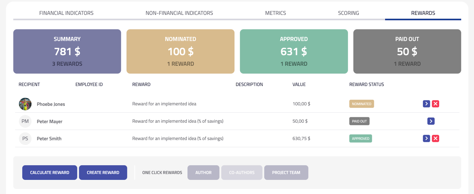 eKaizen automatically displays a prefilled reward amount based on the setup defined in the administration - either as a fixed value or a percentage of savings. You can always adjust the amount manually when creating or editing a reward. - Set the Reward status – Nominated by default, or another if your process allows.