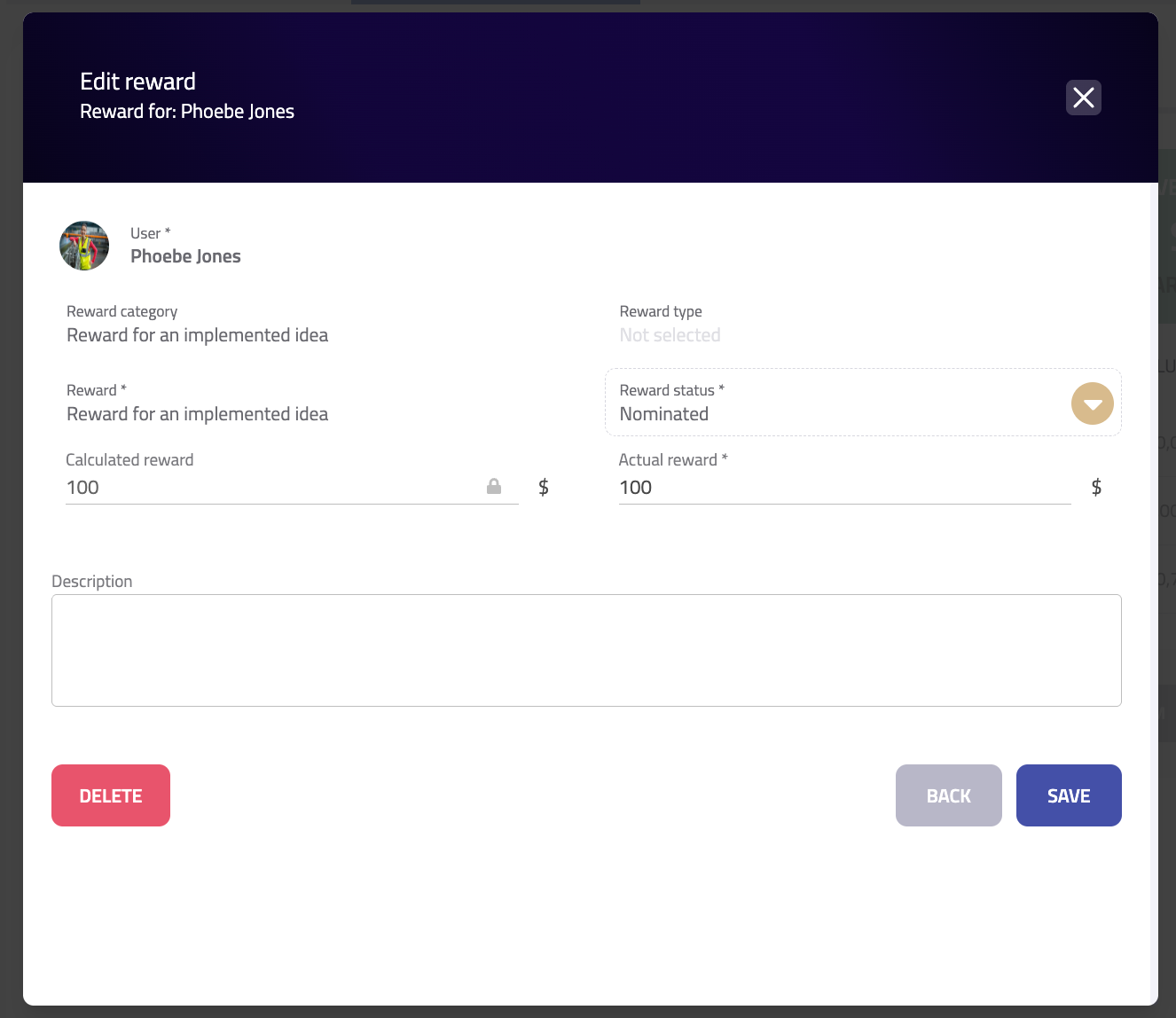- Choose the Reward type (for example, Reward for an implemented idea).