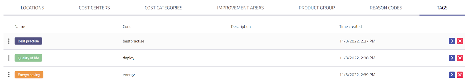 Tags in eKaizen have a graphical (color-coded) component. When a tag is created or edited, it’s assigned a specific color. Wherever tags are shown (e.g., on the Kaizen overview), the color makes them immediately recognizable, so users can quickly distinguish what each tag represents at a glance.