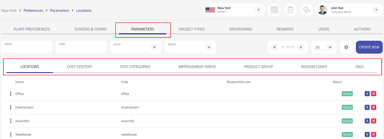 Parameters are configurable settings used to populate drop-down menus across eKaizen (e.g., Submission forms and Project Charters). They help each plant stratify data consistently—by locations, improvement areas, cost structures, tags, and an optional custom label category (an extra category you can define to fit your needs). Parameters are managed per plant and respect role-based visibility. You can access the configuration via Plant Preferences → Parameters.
