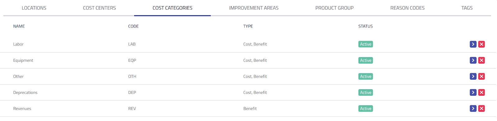 Tabs available: Locations, Cost Centers, Cost Categories, Improvement Areas, Custom category (as defined by each client), Reason Codes, Tags. All of these parameters can be used in filters in the Kaizen overview.