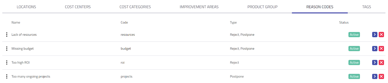 Standardized reasons used when rejecting or postponing ideas. A reason code can be configured for postponing, rejecting, or both (i.e., the same code may appear in either or both decision steps, depending on your setup).