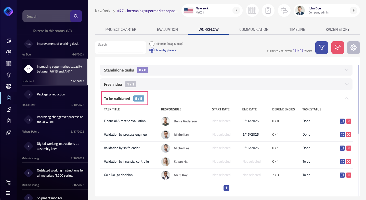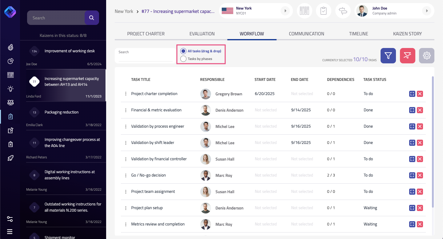 - Tasks by phases – a structured view showing tasks grouped by the kaizen’s current workflow stage