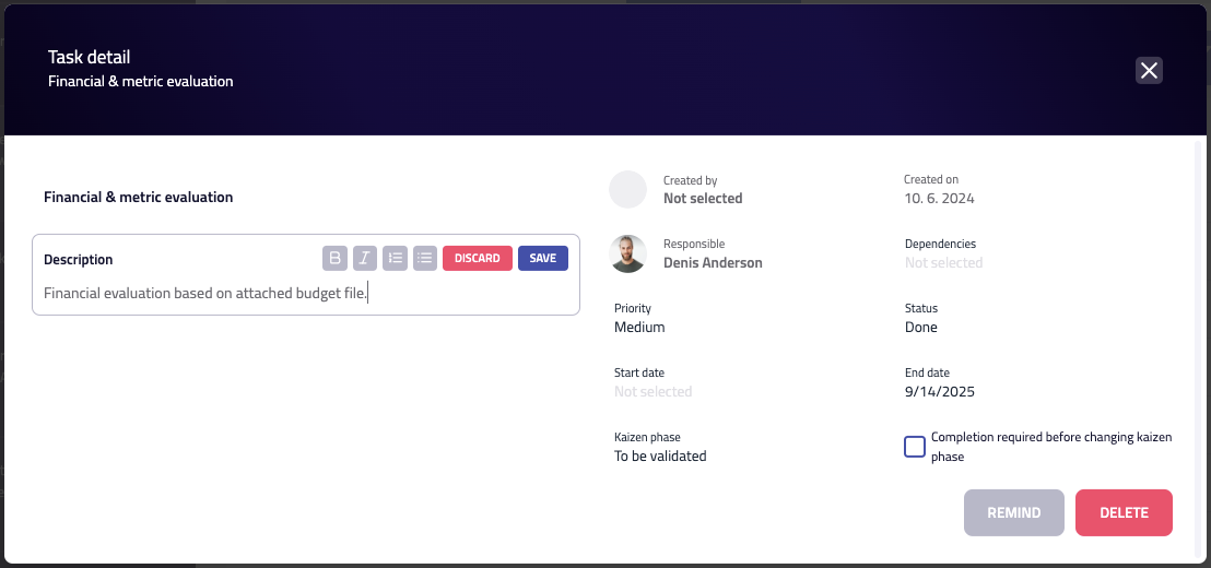 Tasks (accessible via the Workflow tab) help structure and manage the entire lifecycle of an improvement idea or project - from early validation to final review. You can track progress, assign responsibilities, and define dependencies or deadlines to keep things moving.