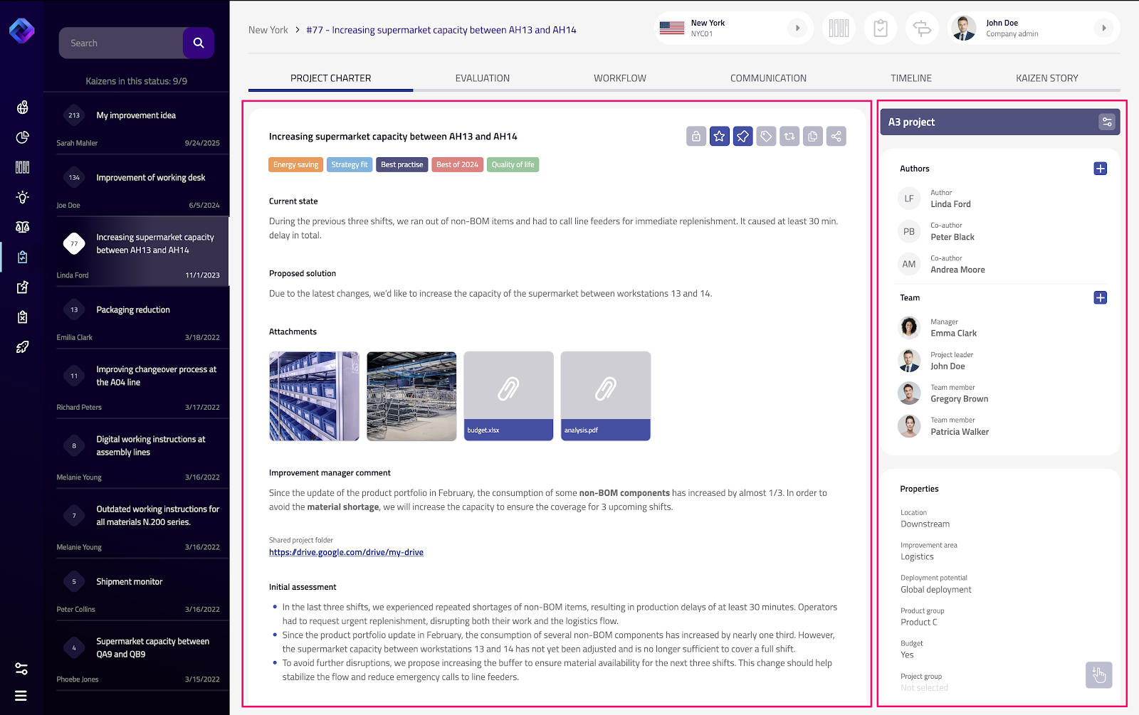 Project Charter is the main screen you work with while managing projects in eKaizen. It contains all essential information - from the initial project proposal created by the author, to the details ad…