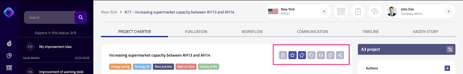 At the top of the main field, you’ll find a set of icons for quick actions, allowing you to manage visibility, classification, and workflow directly from the Project Charter interface.