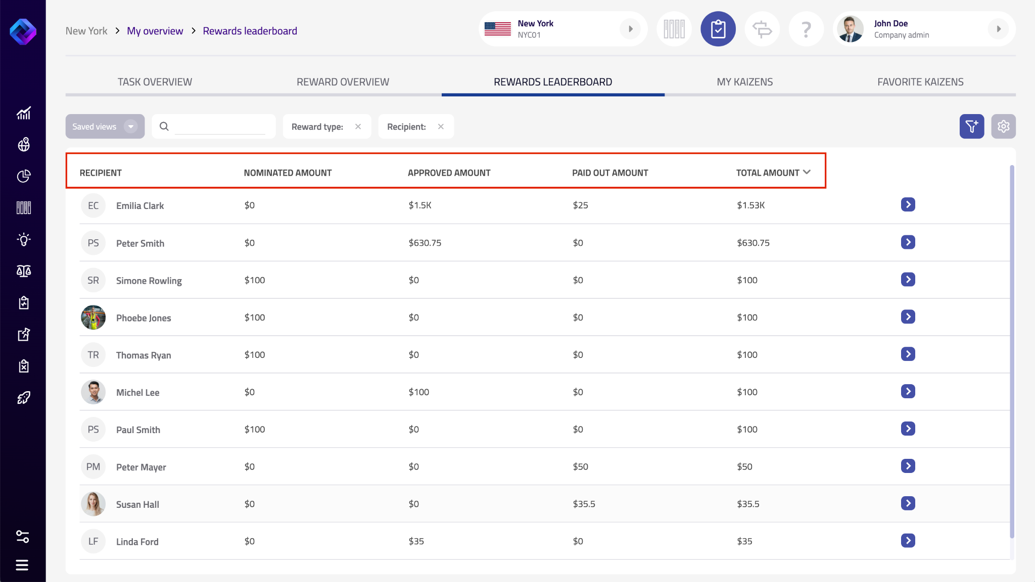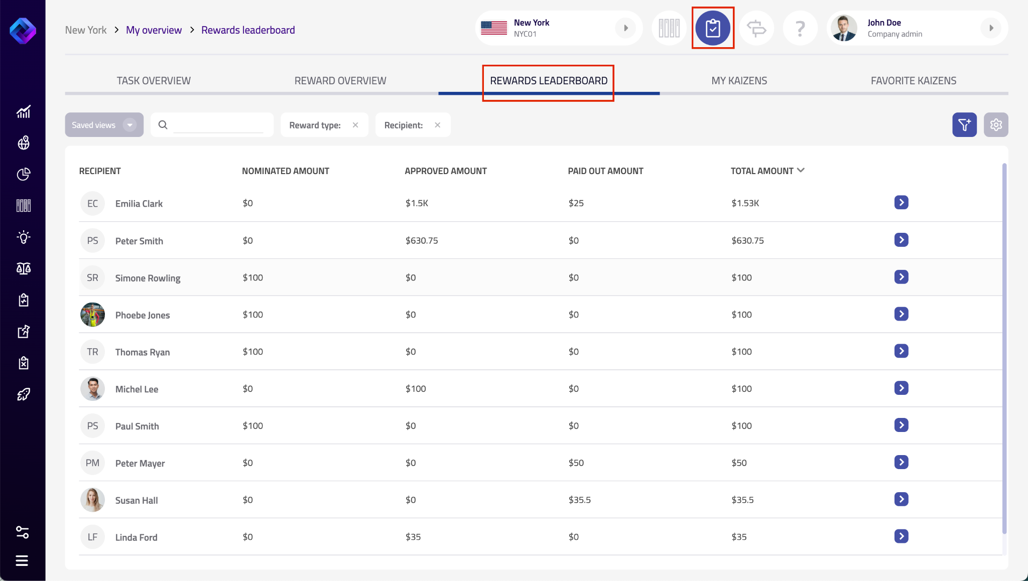 The Rewards leaderboard shows rewards by recipient. It helps you compare what rewards each person has received, broken down by reward status (Nominated, Approved, Paid out). It also shows Points if y…