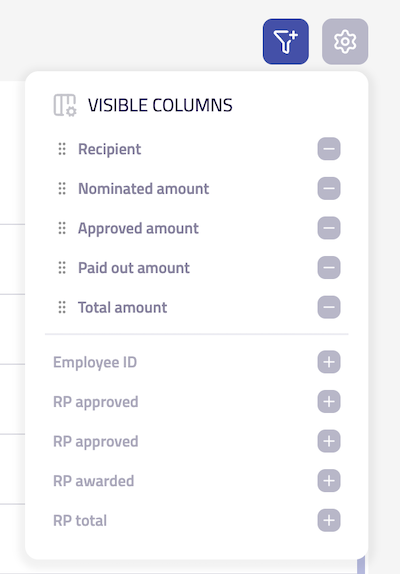 - Columns & statuses (gear icon) – choose which columns are visible and which reward statuses are included in the list.